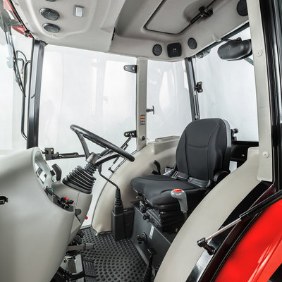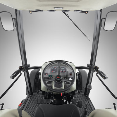The switch panel for front/rear working lights and front/rear wipers is located on the right post offering easy control and operation. Easy-to-read instrument LED panel includes gauges for engine RPM, engine temperature, fuel level, as well as a digital hour meter and PTO on/off indication light. The tractor is equipped with practical joystick for easy control of front loader and aggregated machines and tools.